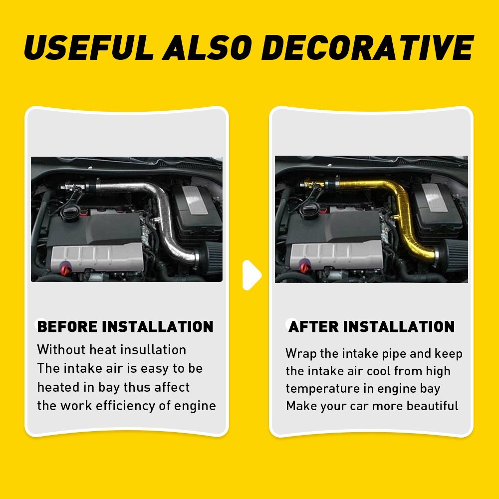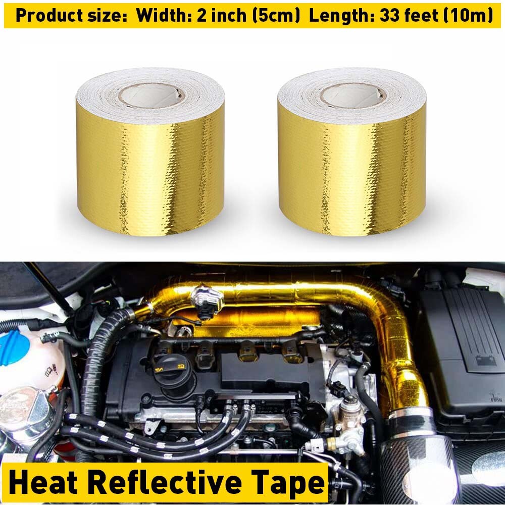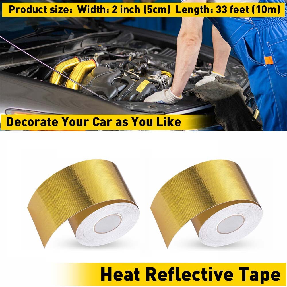 Specifications: Color: Gold Size: 1.width: 2 inch(5cm) 2.longth:33 feet(10m) Material: 1.interior: Pure virgin glass fiber 2.Exterior: Aluminum alloy mylar Fit For: All Intake pipe / Suction Kit All Intercooler Pipes / Turbo Pipes All Heat Exchange Pipes Other Industrial pipes Highly effective material for firewalls, fuel cells, engine covers, under hoods, engine compartment, bulk heads, seat bottoms – anything or area that needs protection from heat.
