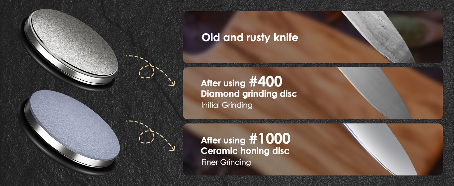 - Diamond-Coated Excellence: The #400 grit diamond-coated grinding disc restores your blade’s sharpness effortlessly, while the second side perfects it to a smooth, razor-sharp edge.