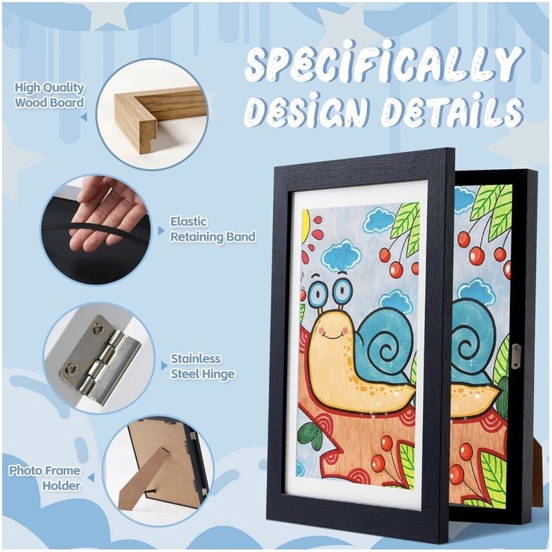 【Engineered for Safety】: With 180-degree front open design, the 8.3x11.7 kids art frames can open like a book, this design allows kids for easy and convenient opening and closing, make them change and display their paintings according to their everyday ideas. And with interior elastic straps for artwork storage