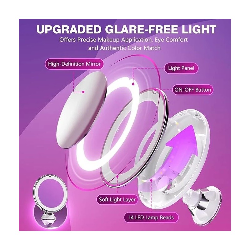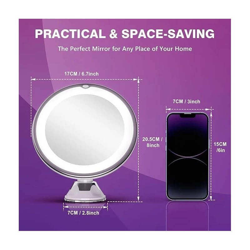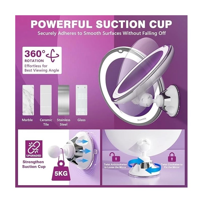 - ๐ฆ๐ง๐ฅ๐ข๐ก๐ ๐ฆ๐จ๐๐ง๐๐ข๐ก ๐๐จ๐ฃ & ๐ฏ๐ฒ๐ฌยฐ ๐ฅ๐ข๐ง๐๐ง๐๐ข๐ก - Our magnifying mirror with light features a strong suction cup that adheres to virtually any smooth, clean, flat surface like glass, ceramic, porcelain, enamel, acrylic, fiberglass, or polished marble. The LED magnifying makeup mirror has a 360ยฐ rotation capability, ensuring versatile and convenient positioning for optimal use.