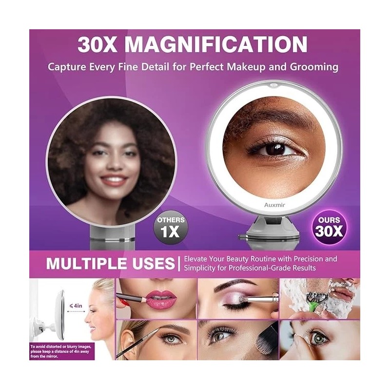 - ๐ฃ๐ข๐ช๐๐ฅ๐๐จ๐ ๐ฏ๐ฌ๐ซ ๐ ๐๐๐ก๐๐๐๐๐๐ง๐๐ข๐ก ๐ช๐๐ง๐ ๐๐๐๐๐ง - Our LED makeup mirror with a powerful 30X magnification provides exceptional clarity and precision for deep makeup application, contact lens insertion, skincare routines and precise grooming tasks like plucking eyebrows and eyelashes. NOTE: The 30X magnification is extremely powerful, for a clear, undistorted image, keep your face within 4 inches of the mirror.