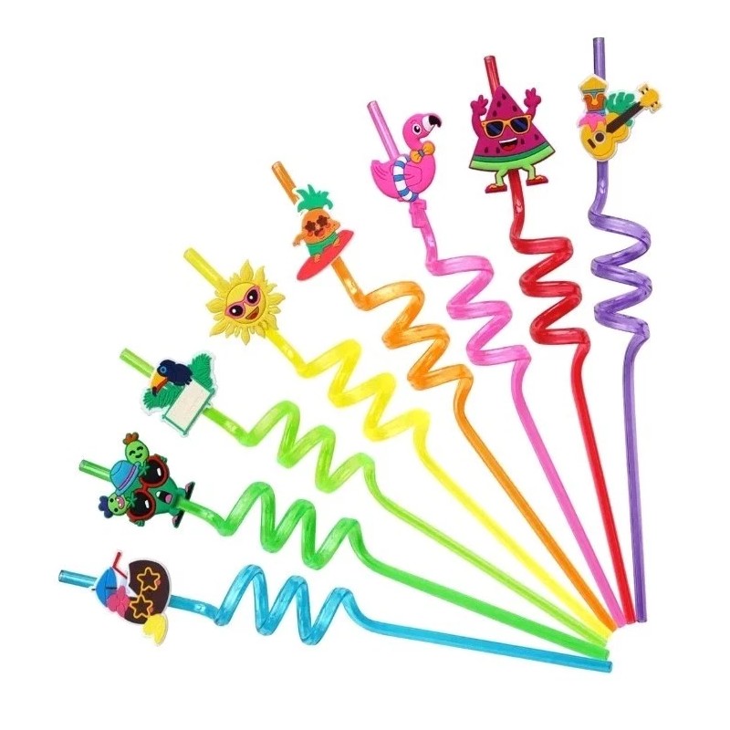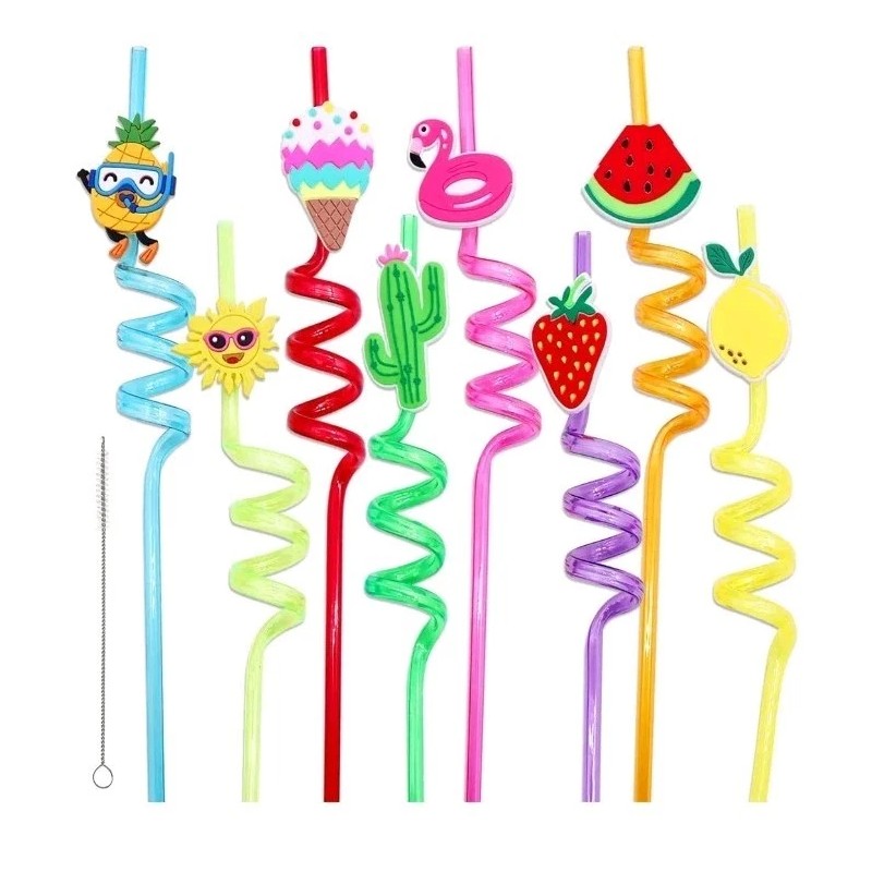 The product is a 24-piece set of reusable Crazy Straws, perfect for parties. The straws come in a variety of fun colors and include colorful toppers to add excitement to your party. Made of plastic and easy to clean, these straws are designed for a party occasion and are sure to bring joy to your celebrations. Made in China, this set includes a cleaning brush for convenience. There are a variety of colors and toppers, therefore each package may be a unique mixture of fun designs!