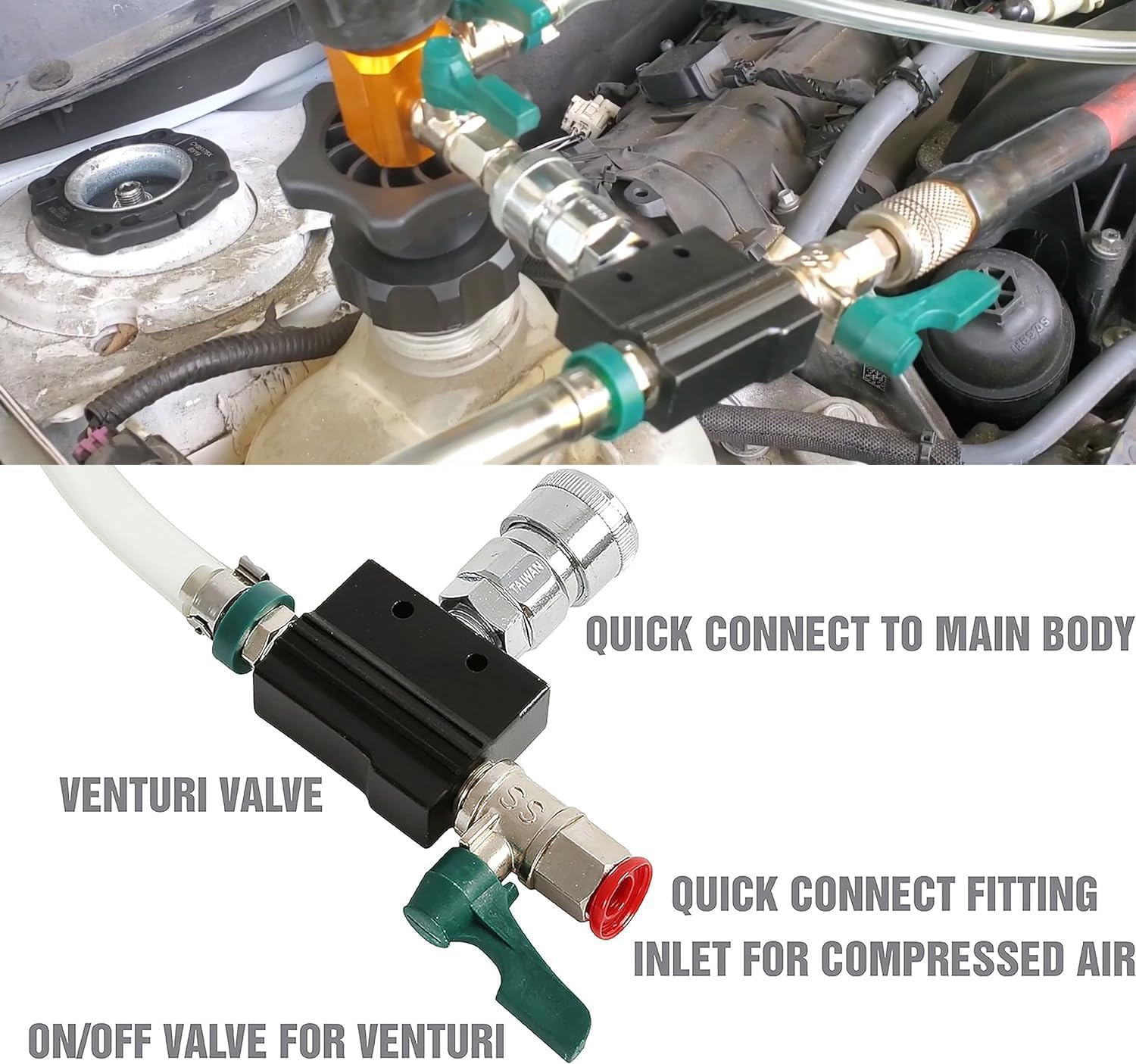 With 70-110 PSI recommended working pressure, The coolant pressure tester could easily identify cooling system issues; Monitor the gauge reading while it’s under the vacuum to uncover leaks. This Vacuum Coolant Refill Tool helps drawing a vacuum on the cooling system to remove trapped air from the cooling system, preventing engine damage caused by overheating. It also enhances efficiency by rapidly purging air and refilling coolant, reducing the risk of come-backs.