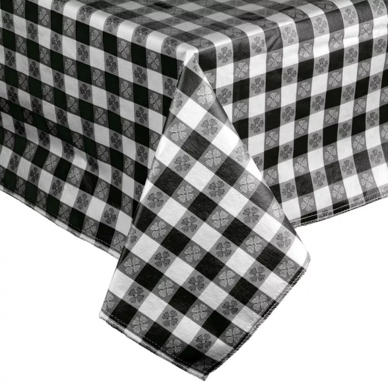 Create custom-length table covers with this 25-yard roll of black-checkered vinyl table cover fabric. Perfect for outdoor decks, poolside cabanas, casual catered events, or classic diners, this roll of black-checkered vinyl table cover fabric provides a fun, retro look, while keeping your tabletops free of spills and splatters. The fabric features a flannel back, ideal for protecting tabletops from scratches and for adding weight to keep your table covers in place. The vinyl outer layer resists tearing and damage from spills, and can withstand rain if left on the table between uses. Providing a longer life than disposable table covers, this easy-to-clean vinyl table cover can be wiped clean after each use with no laundering required.