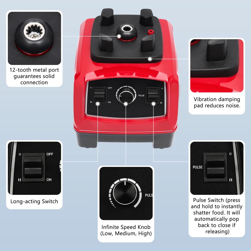 🔶Control Panel: The panel includes long-acting switch, pulse switch (press and hold to instantly shatter food after turning on the machine, and then use the long-acting switch. It will automatically pop back to close if releasing and is suitable for large pieces of food or ice), and speed control knob (low, medium and high) for simplicity and clarity of use.
