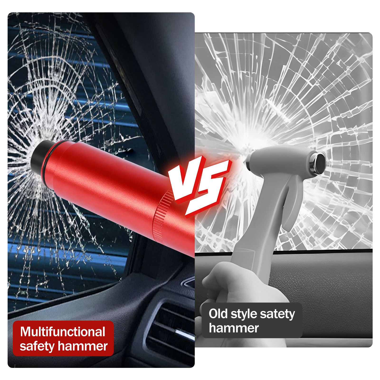 [2-in-1 Car Escape Tool] Our 2-in-1 car escape tool includes a safety hammer and seatbelt cutter. In case of an emergency, you can break the strong car window glass in one second with just one finger pressure, safe and reliable