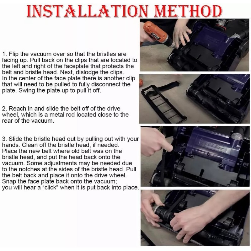 **Please Note: When comparing your old belt to the new one, it is common for the new belt to be 1" to 3" shorter in length than the old, stretched and worn belt. You should have to stretch the belt fairly hard put the brush-roll in place, it is this tension that causes the brush-roll to turn. Once the brush-roll is in place, make sure the brush spins easily by turning with your hand and the belt is not pinched between the roller and the housing, this would cause the belt to snap immediately if not corrected. It is always a good idea to have spares on hand.