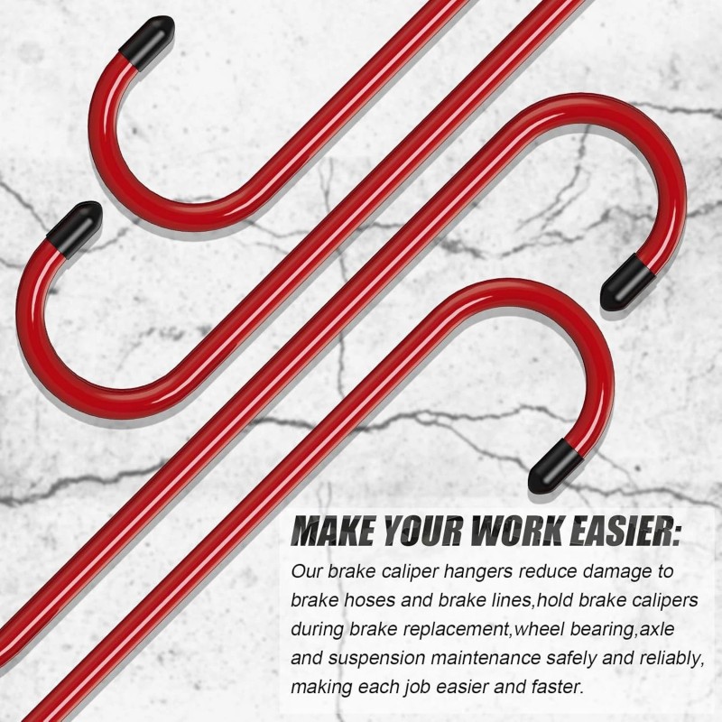 Perfect brake tool for caliper work Our brake caliper hook is the perfect tool to hold brake calipers out of the way, reducing the possibility of damage to calipers, brake hoses and other parts. Use of dedicated repair tool makes the automotive work quicker and save your time for added productivity. our brake caliper hangers are made of durable steel, with sturdy construction, not easy to break, can withstand a weight rating of approximately 100 pounds, safe and durable for you to use. 2 per set, and 4 extra rubber tips.