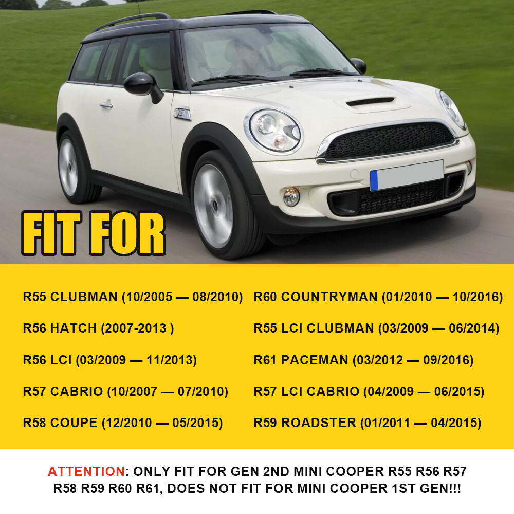 Fit for: R55 Clubman (10/2005 — 08/2010) R56 Hatch (2007-2013 ) R55 LCI Clubman (03/2009 — 06/2014) R56 LCI (03/2009 — 11/2013) R57 Cabrio (10/2007 — 07/2010) R57 LCI Cabrio (04/2009 — 06/2015) R58 Coupe (12/2010 — 05/2015) R59 Roadster (01/2011 — 04/2015) R60 Countryman (01/2010 — 10/2016) R61 Paceman (03/2012 — 09/2016)