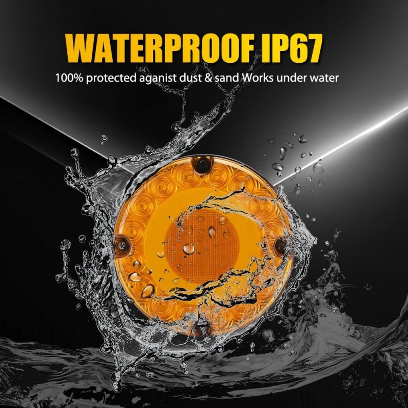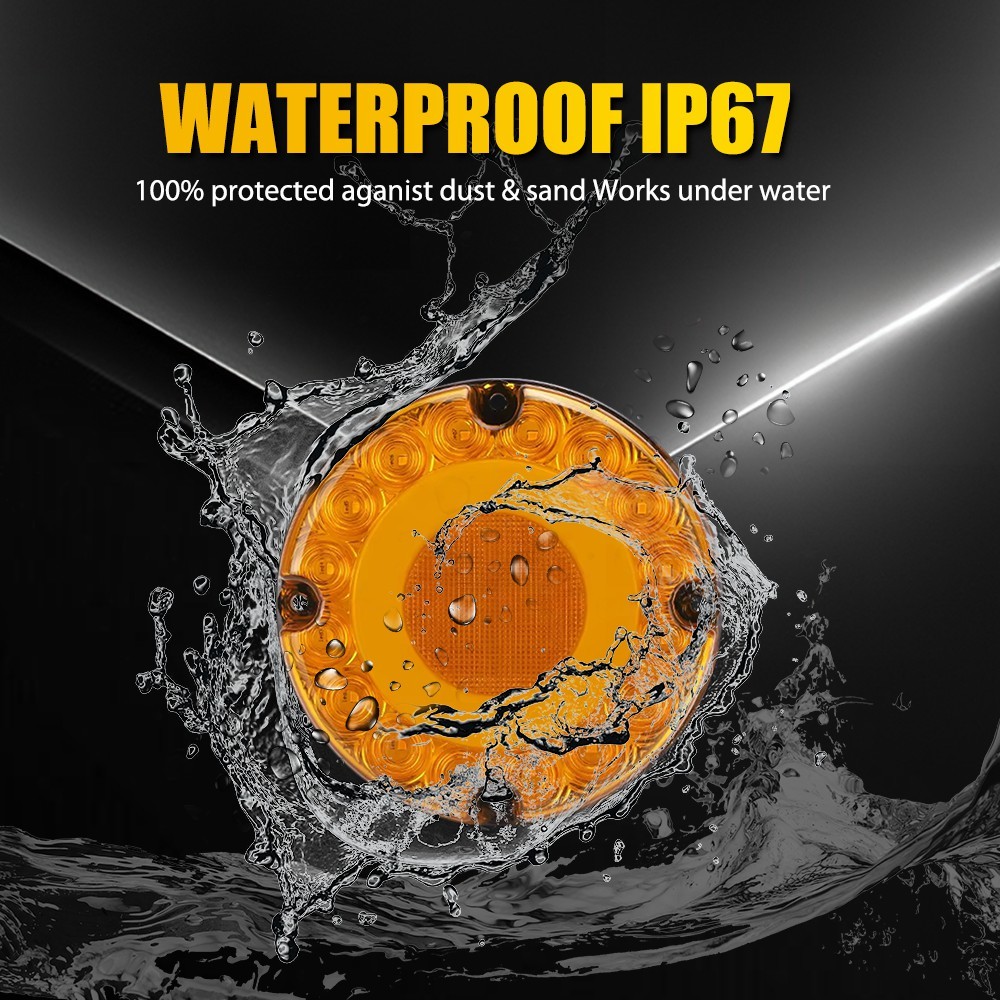 Specifications: Product Material: ABS+PC Light Color: Amber Voltage: 12-24V LED Quantity: 36 Size: 7inch round Functions: Brake light, tail light, turn signals, etc Wiring Mode: Black wire: Negative Red wire: Amber light on the outer ring of running light Yellow wire: Amber light in the inner circle of the brake light Blue wire: Flashing amber light Waterproof Grade: IP67 Lifespan: 50,000h+