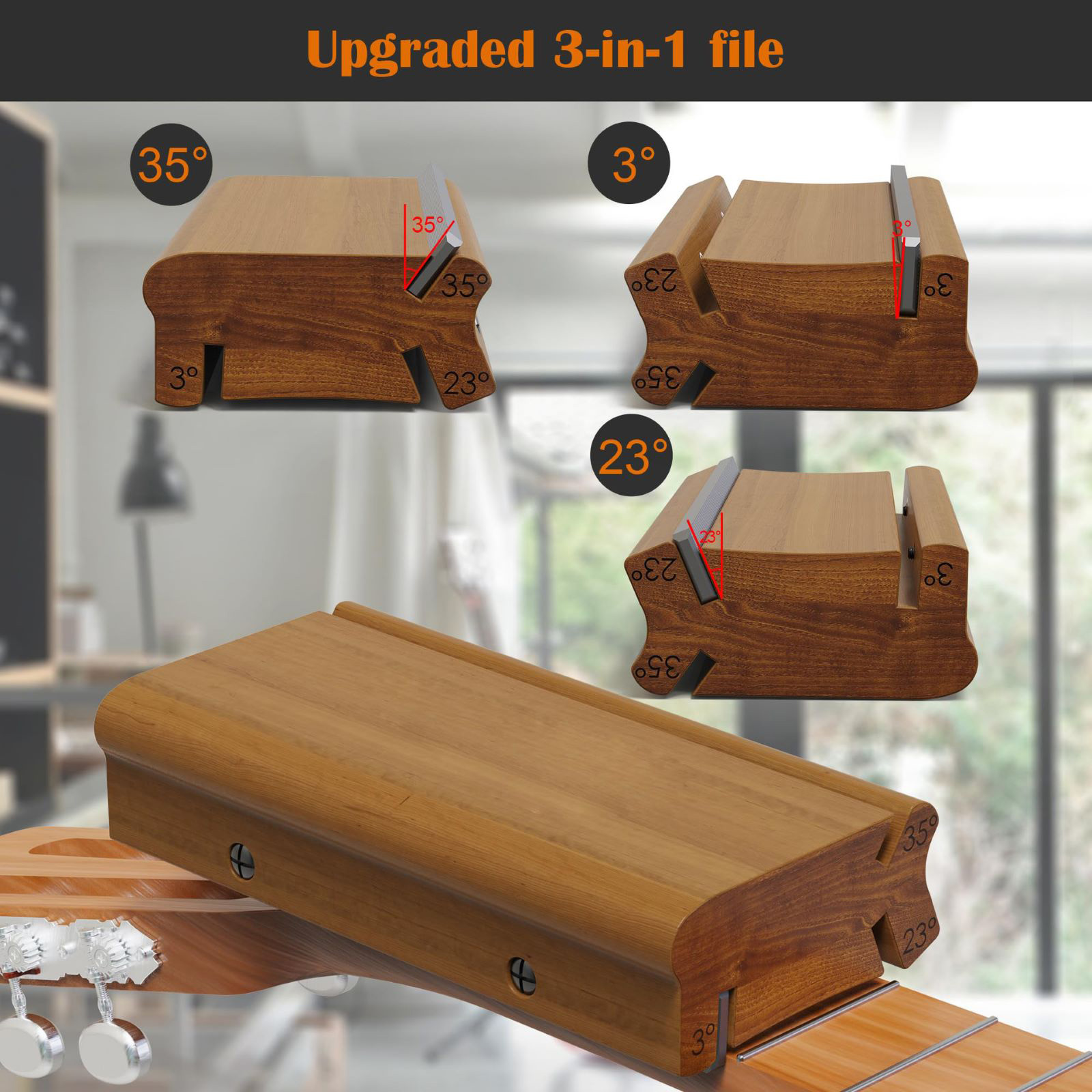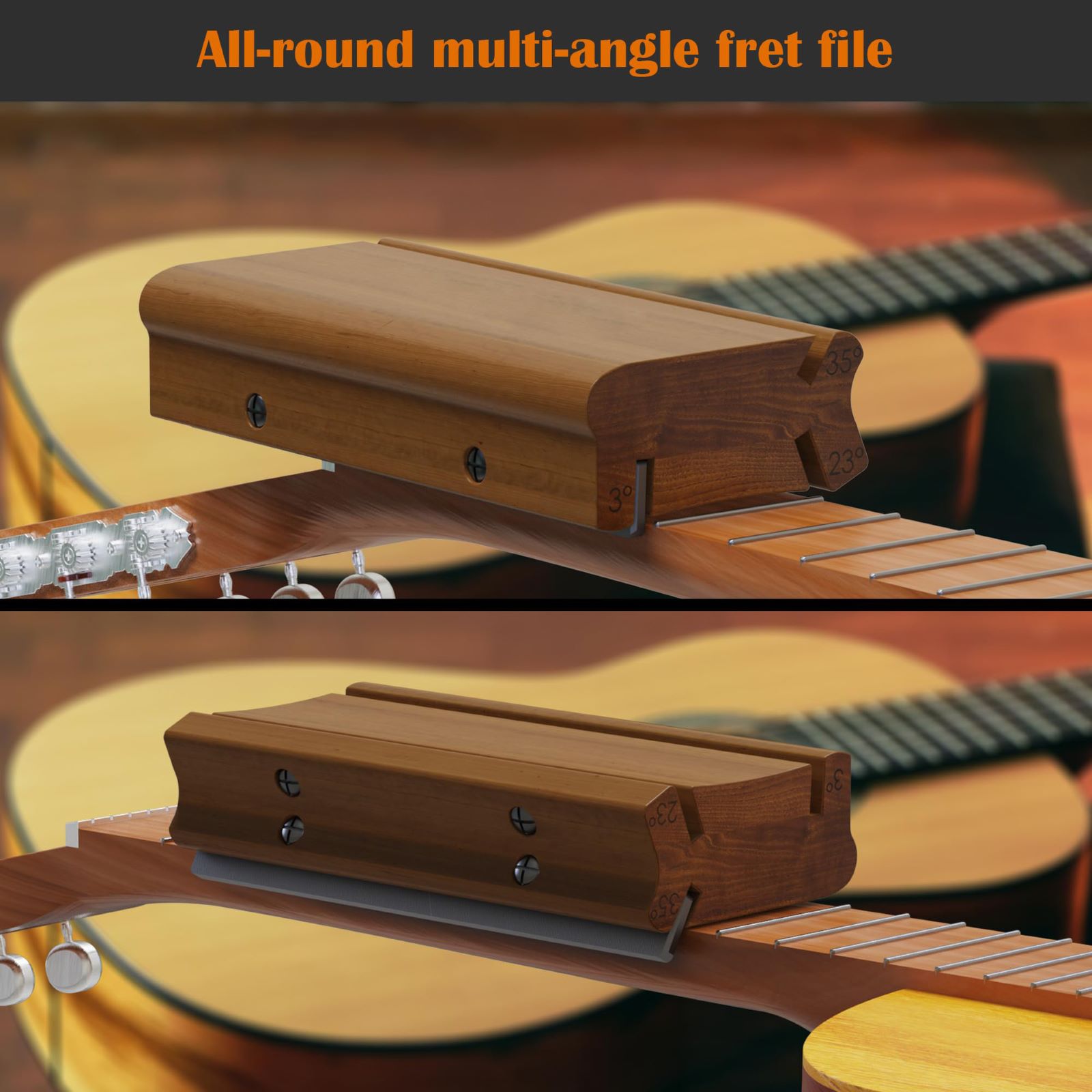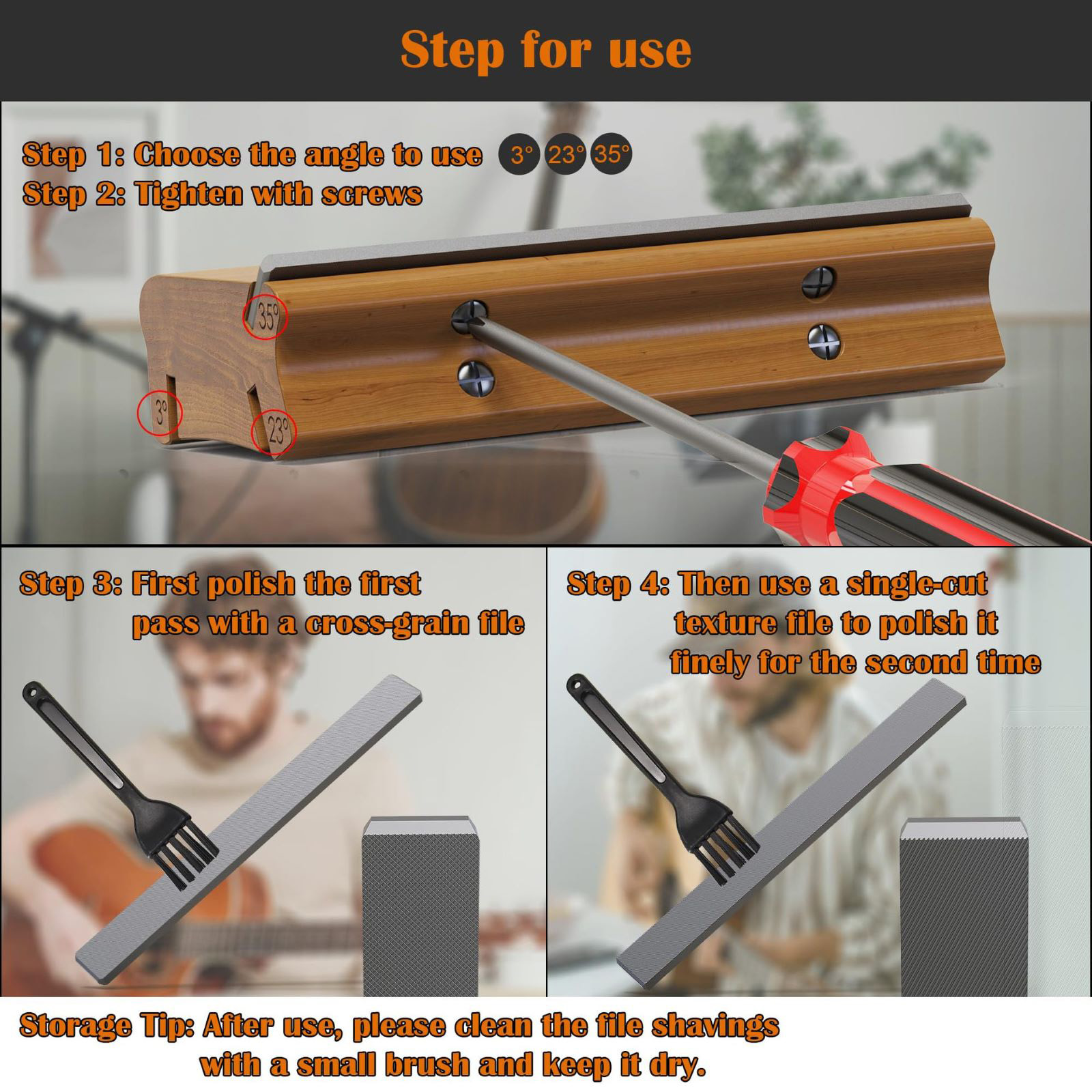 Multi-Angle Design for Efficient Burr Removal: The 3-in-1 Beveled File comes with 3°, 23°, and 35° angles, allowing for easy switching to meet different needs. It effectively removes burrs and impurities from frets and bridges of instruments such as guitars. By selecting the appropriate angle and sequence for grinding, it significantly enhances work efficiency and ensures a smooth, damage-free surface on the instrument.