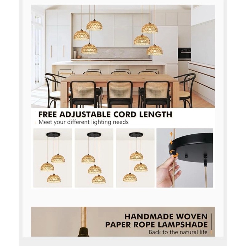 Adjustable Hanging Height: Our large pendant light comes with adjustable hanging rope length, allowing you to adjust the height of the three lampshades according to your preference. Therefore, these rattan chandeliers can be installed on different types of ceilings, including flat, sloped, and arched ceilings.