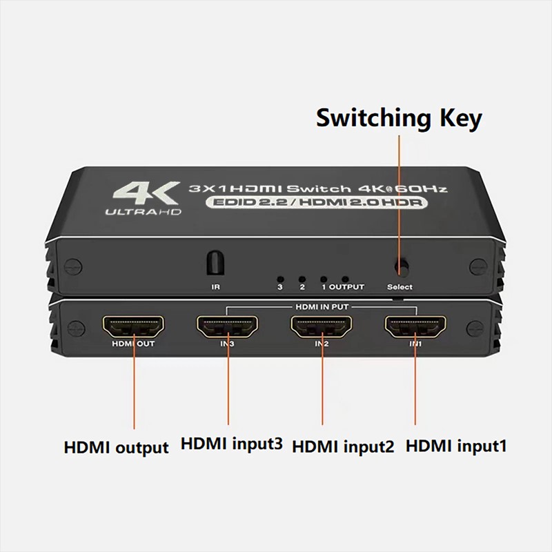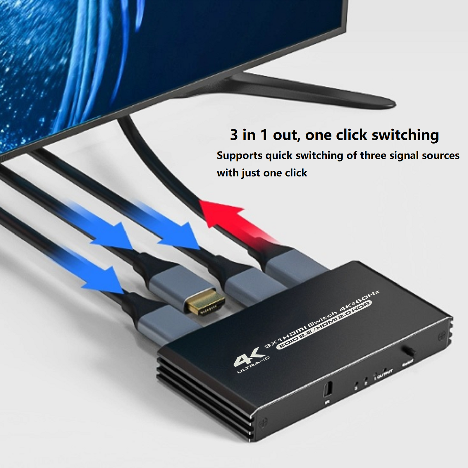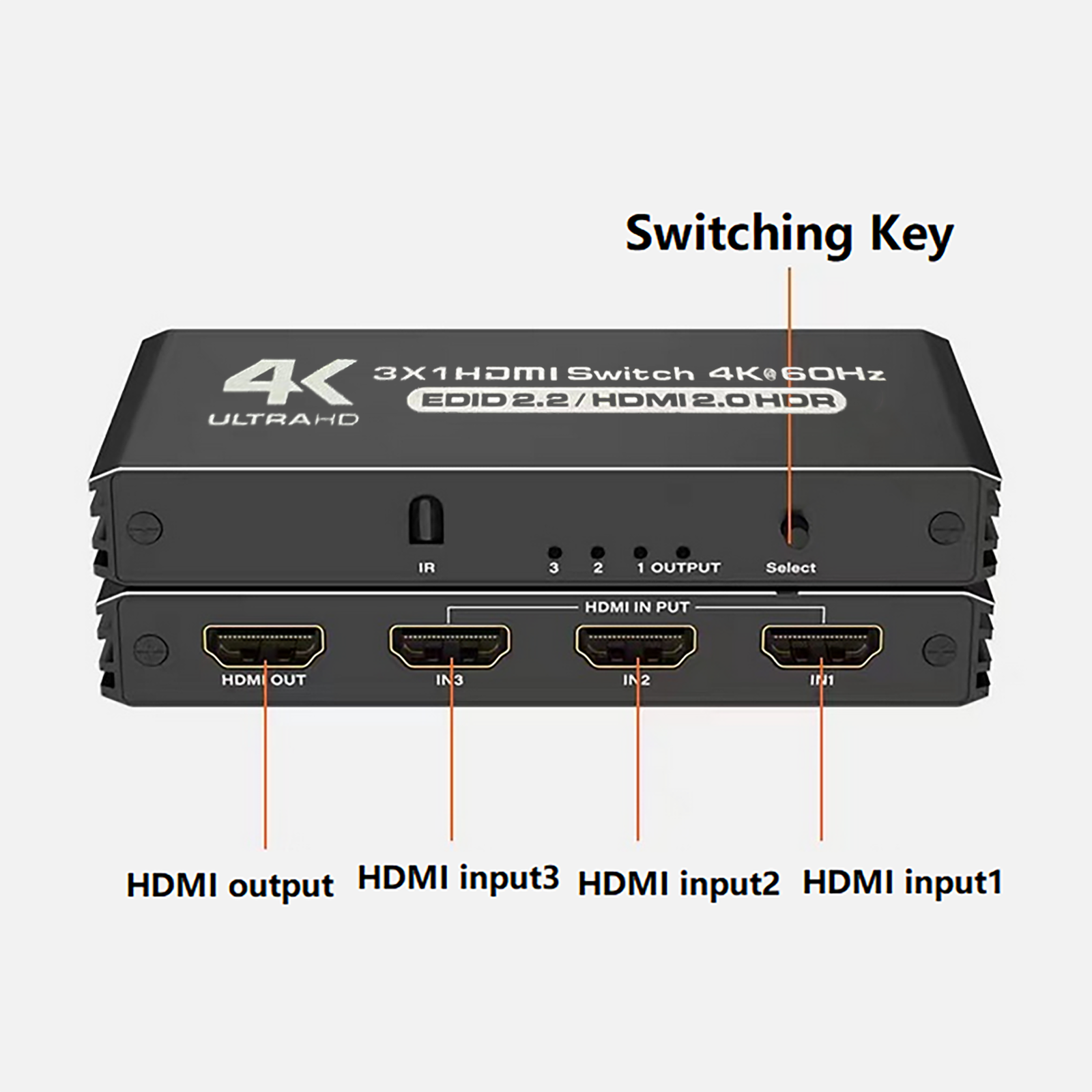 2. Freely switching three digital audio and video HDMI signal source inputs to the display device.