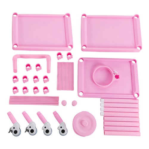 Specification  Color: Pink Style: Modern Shape: Rectangular Material: Rubber, ABS Process: Integrated Molding, Injection Molding Assembly Required: Yes Mount Type: Freestanding Number of Tiers: 3 Number of Universal Wheels: 4 Noise: About 20dB Max. Overall Load Capacity: Approx. 100kg/220.46lbs Waste Bin Outlet Diameter: 19cm/7.48in Drawer Height: 9cm/3.54in Each Tier Size: 44*32*28cm/17.32*12.6*11in Product Size: 54*37*98cm/21.26*14.57*38.58in Package Size: 55*51*26cm/21.65*20.08*10.24in Gross Weight: 9kg/19.84lbs Net Weight: 8.5kg/18.74lbs   Package Included 1* 3-tier Salon Trolley 1* Waste Bin 4* Universal Wheels Other Accessories for Assembly