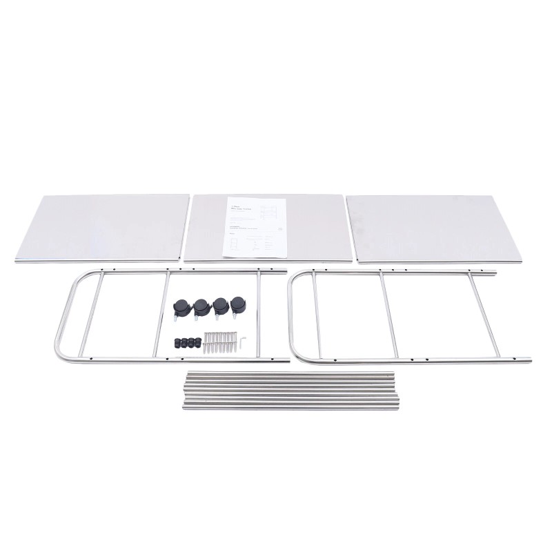 Package contains: 3 stainless steel boards, 9 assembly rods,2 stents, 4 wheels, 4 feet,English installation instructions, tools and accessories.