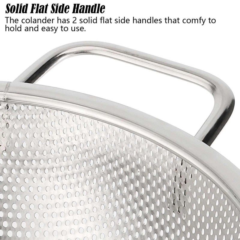 · Solid Flat Side Handle: The colander has 2 solid flat side handles that comfy to hold and easy to use.
