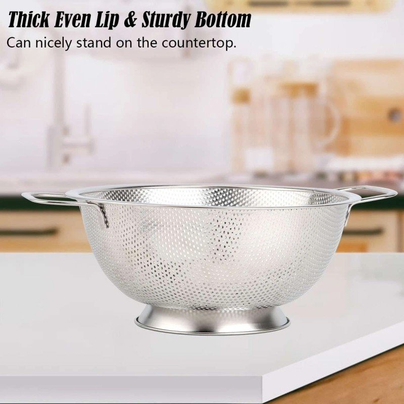 · Thick Even Lip & Sturdy Bottom: The stainless steel colander has a thick even lip and a sturdy holder base that can nicely stand on the countertop.