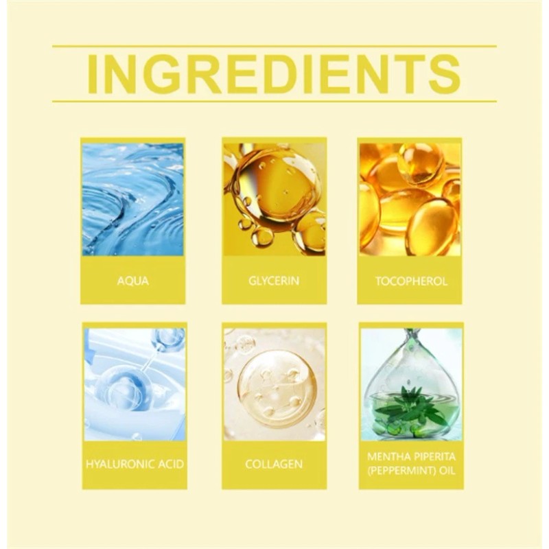 - Ingredients: Water, glycerin, tocopherol (vitamin E), hyaluronic acid, collagen, peppermint oil