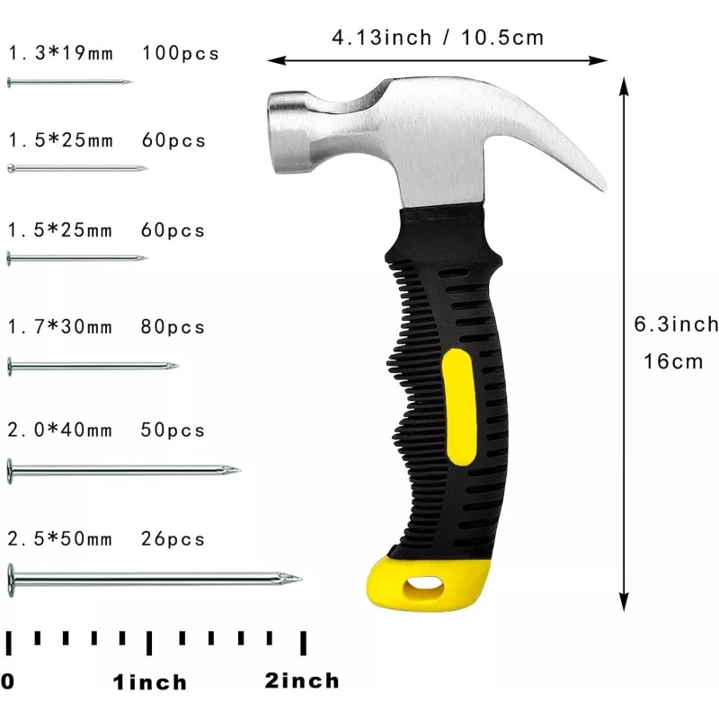 - Mini stubby hammer With comfort ergonomic grip handle and curved claw design,great compact and easy to use for kids and women.The wall nails for hanging set includes a high-quality plastic transparent box with 6 compartments,According to size and type,Total 376 pcs nails are all sorted and neatly placed into it.No time will be wasted looking for nails of the right size,making your projects swifter and more professional.