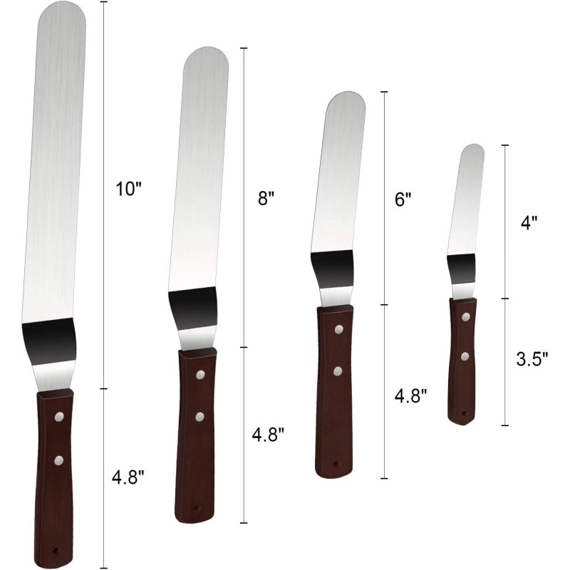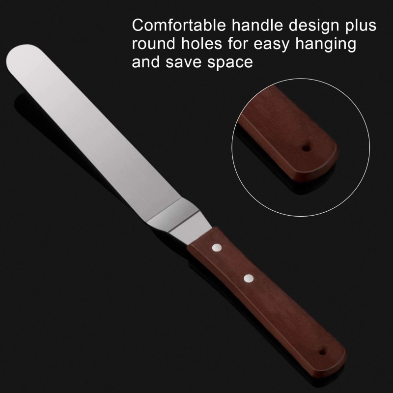 Material: The blade is made of high quality stainless steel, and the handle is made of natural wood. Each Icing Spatula has a small hole for easy hanging