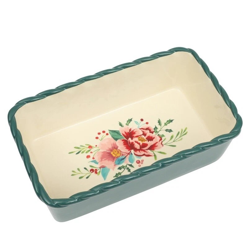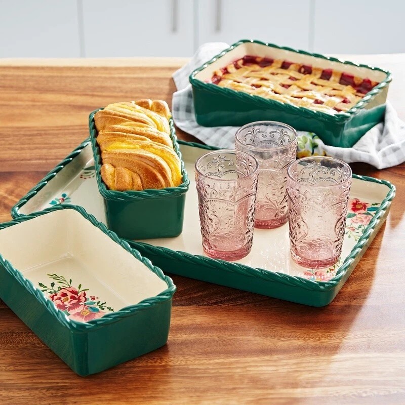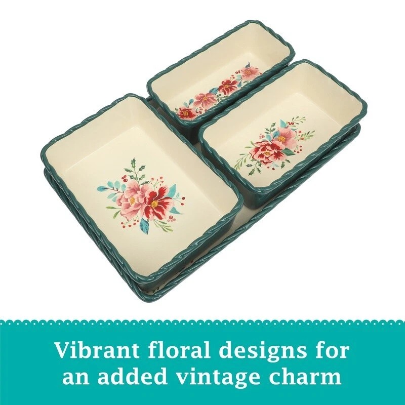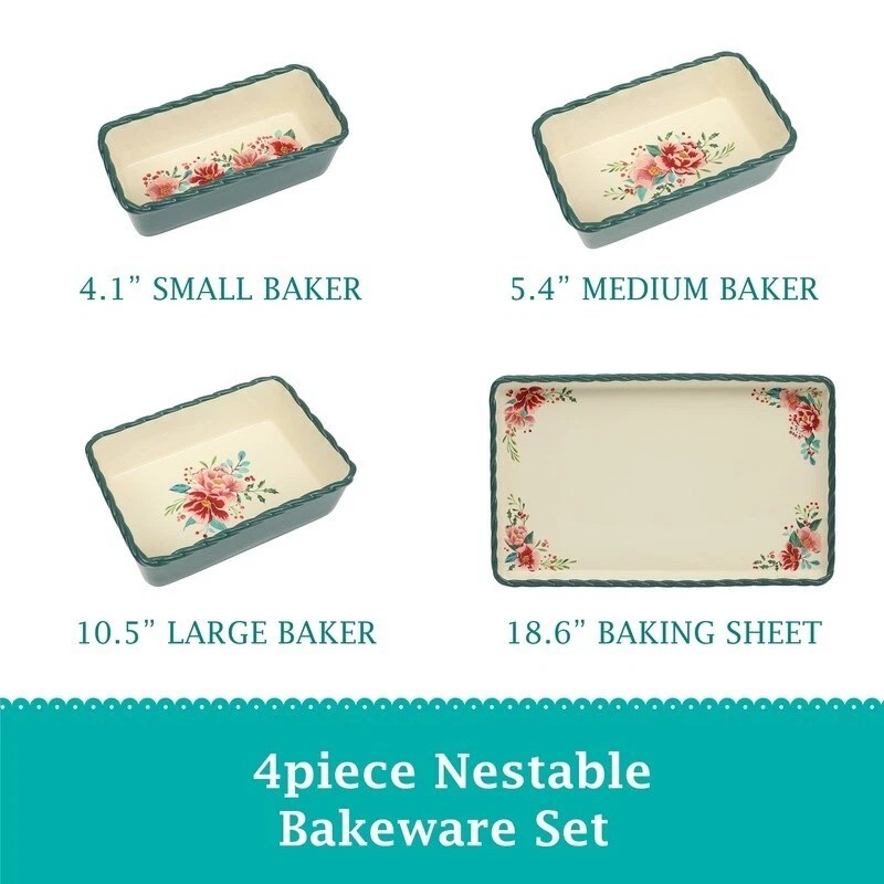 One 4. 1-inch small baker, one 5. 4-inch medium baker, one 10. 5-inch large baker and one 18. 6-inch baking sheet Stoneware construction offer even baking and browning Bold floral prints for an added vintage charm Nestable design save space in any storage Dishwasher, microwave and oven safe