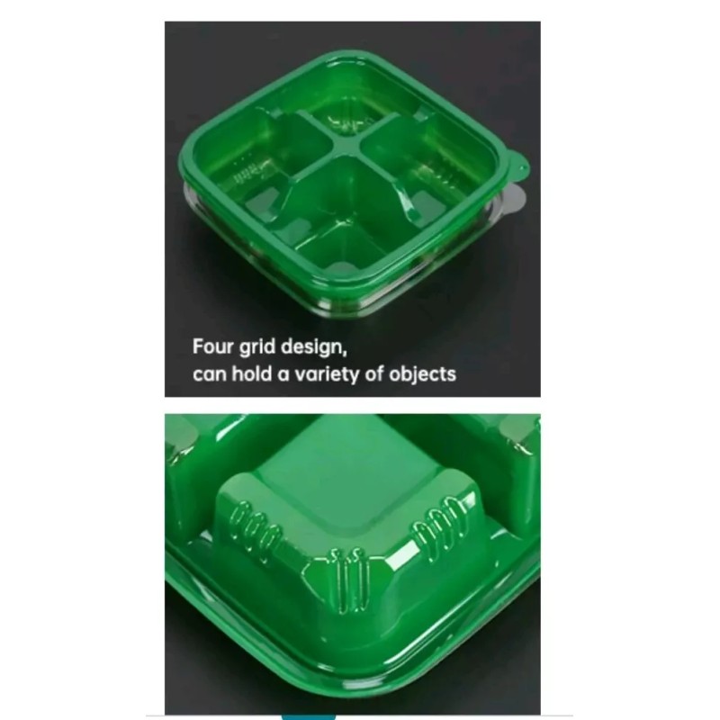 This set of four plastic bento take-out containers is perfect for those who want a convenient and stylish way to store and transport food. The square shape of the containers makes them easy to stack and store in your kitchen or on-the-go. Each container is made of thin plastic and is reusable or disposable. The set includes four containers. The containers are perfect for snacks ,storing leftovers or food prep.