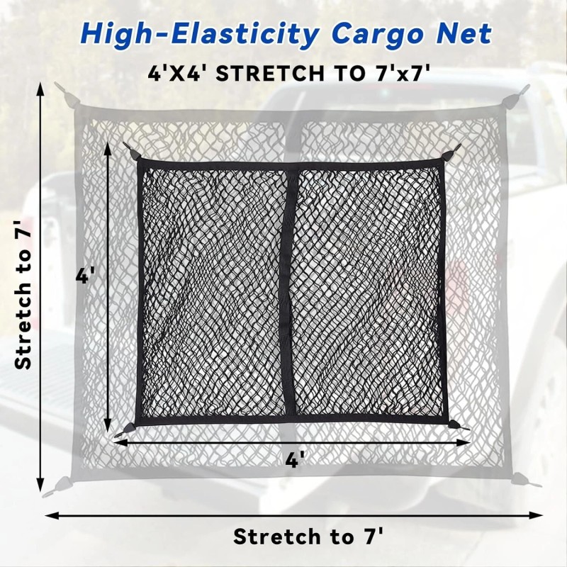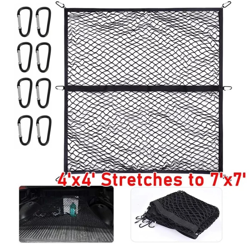 4'x4' Stretches to 7'x7': With impressive adjustability, this cargo net starts at 4'x4' and easily stretches to 7'x7', ensuring versatility to fit various truck bed sizes.