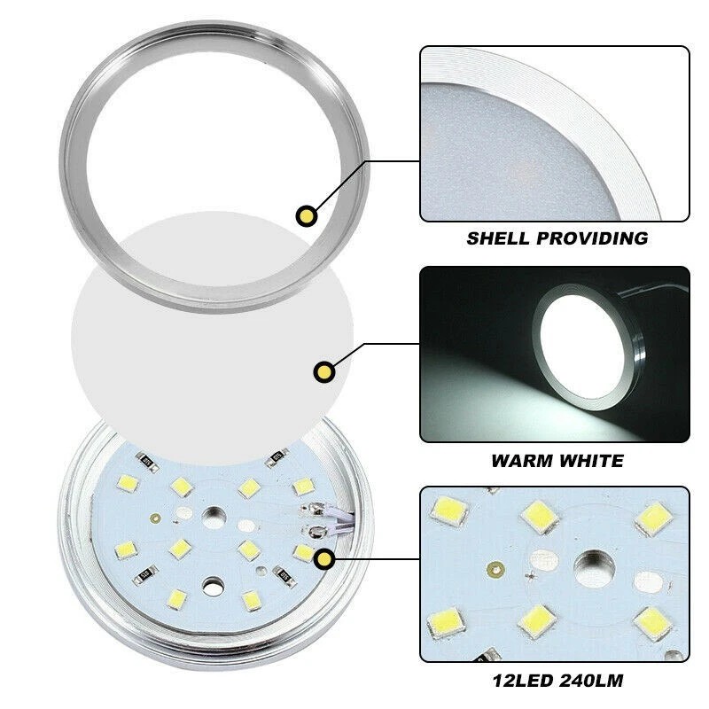 4X 12Volt Cool White Caravan Camper Trailer Car Boat Led Down Ceiling Lamp With Switch Power supply Item Description: Feature: • Alternative for traditional halogen light fixture, ideal lighting for RV, motor home, trailer cargo, boat, etc. Perfect illumination for under cabinet, cabin, compartment, display case, locker, etc. • Chrome surface treatment, antirust and elegant housing. • High grade chips strongly backup great output without causing eyestrain. • Multiple lights together presents impressive illumination. • Efficient heat dissipation, safe and durable. • Fast recessed mount design, quick and easy installation. • Twist-off design, detachable cover to expose screw holes. Please make sure its size meets your need before you place order. Item Specification : Specifications: • Voltage: 12V DC • Lighting color: Pure white(2W) • Luminous flux: 120 lumens • Beam angle: 120 degrees • Color temperature: 5500-6000K • Light Source:SMD 2835 • Size: 59.1*7mm • LED:12LED • Line Length: 2M Packing Content: 4x Downlights 1x Male connector 1x junction box Switch Power Supply