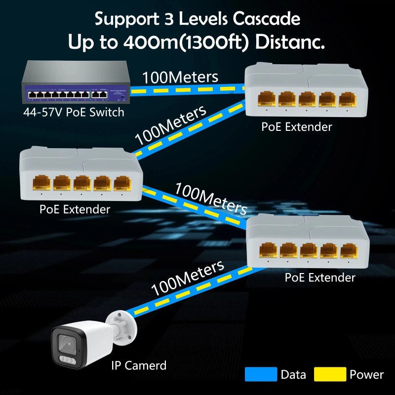 2. Network POE Extender Extends Additional 100m(330ft) Distance, Support 3 Levels Cascade Up to 400m(1300 ft) Distance.