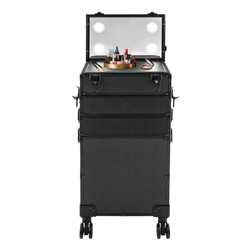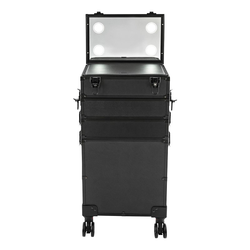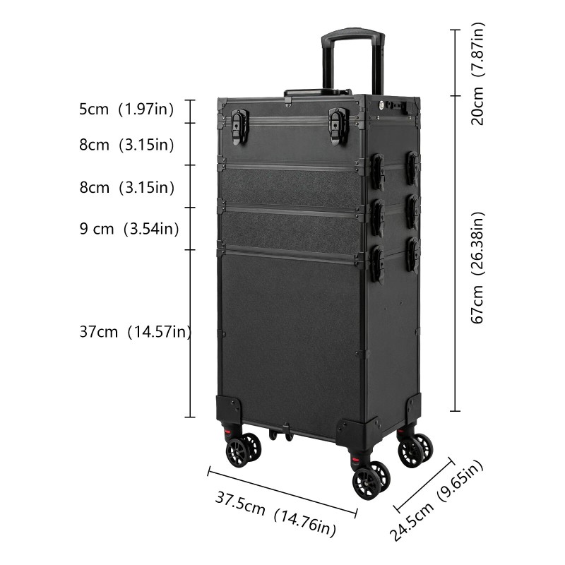 Specifications Material: Plastic, Aluminum Alloy, PVC Color: Black Style: Modern Shape: Rectangular Assembly Required: Yes Mounting Type: Floor Standing Wheel Type: Removable Universal Wheel Carrying Method: Hand-held, Hand-pulled Light Source: 4*LEDs Light Colour: White, Yellow, Neutral Colour Temperature: 3000-6500K Voltage: 12V Power: 20W Load Bearing Capacity: 30kg /66.1lbs Number of Tiers: 5 Plug Type: US Standard USB Cable Length: 1m/3.3ft Power Cable Length: 1.5m/4.92ft Telescopic Rod Extension Height from Case: 20cm/7.87in LED Functional Area Height: 5cm/1.97in Second Box Height: 8cm/3.15in Third Box Height: 8cm/3.15in Fourth Box Height: 9cm/3.54in Bottom Box Height: 37cm/14.57in Overall Product Size: 37.5*24.5*67cm/14.76*9.65*26.38in