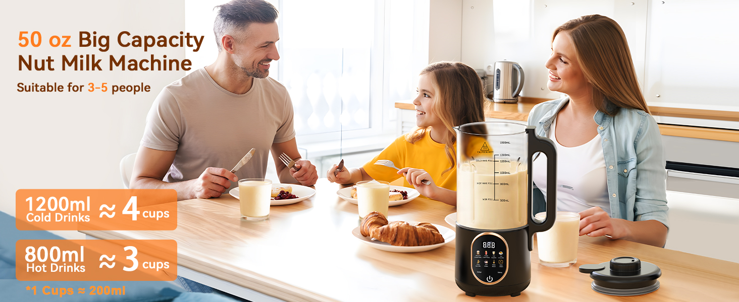 The nut milk machine maker has an extra large capacity of 50 oz and can make up to 5-6 cups of fresh plant milk at a time; This oat milk maker offers a low-noise soundproof design, you have the freedom to customize milk for breakfast every day, including almond milk, cashew milk, oat milk, soy milk, smoothies, and hot or cold vegan milk. It is very suitable for sharing with the whole family and you can enjoy all-natural, healthy and nutritious nut milk at home.