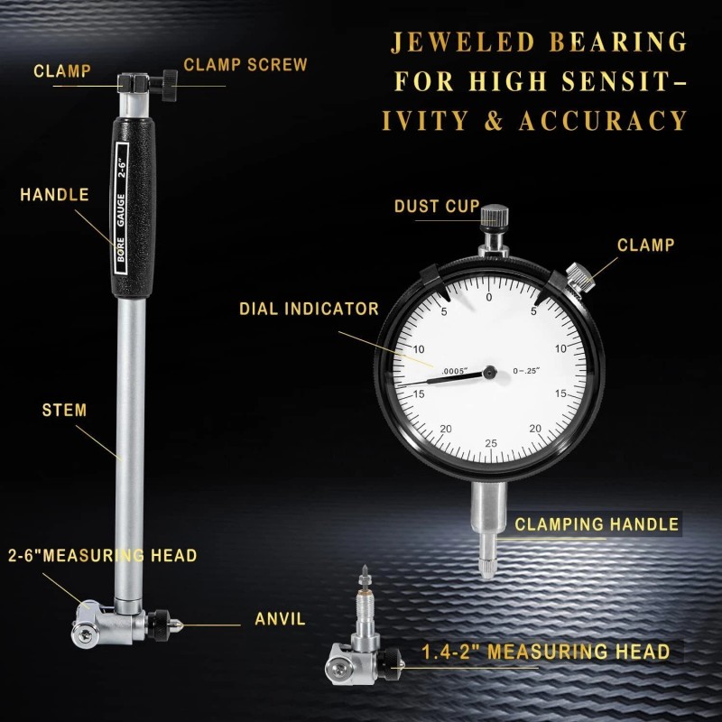 Set includes a bore gage with an insulated grip, 2x self-centering measuring heads, 9 x 2- 6 " anvils, 3 x 1.4-2 " anvils, a extender holder and one fitting case.