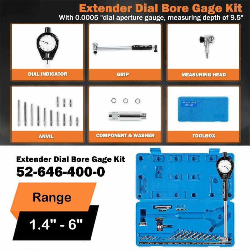 The bore gage features a dial indicator with a graduations of 0.0005" and a measuring depth of 9.5", and has a measurement range of 1.4 to 6 ". Directly replace part for 52-646-400-0