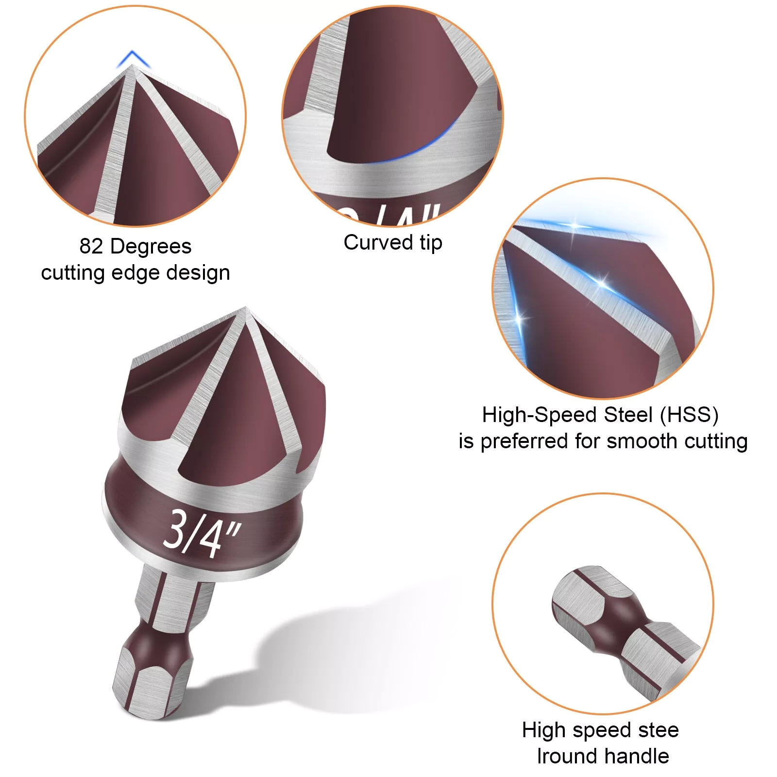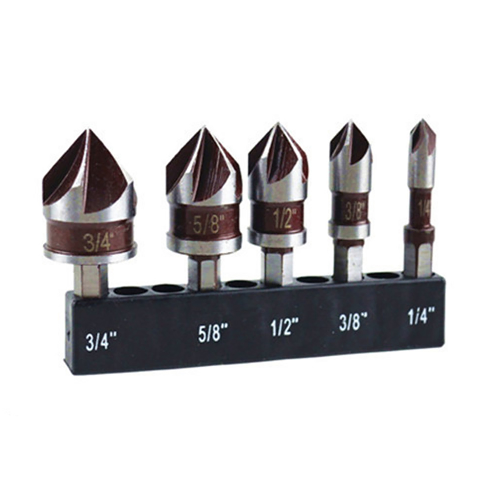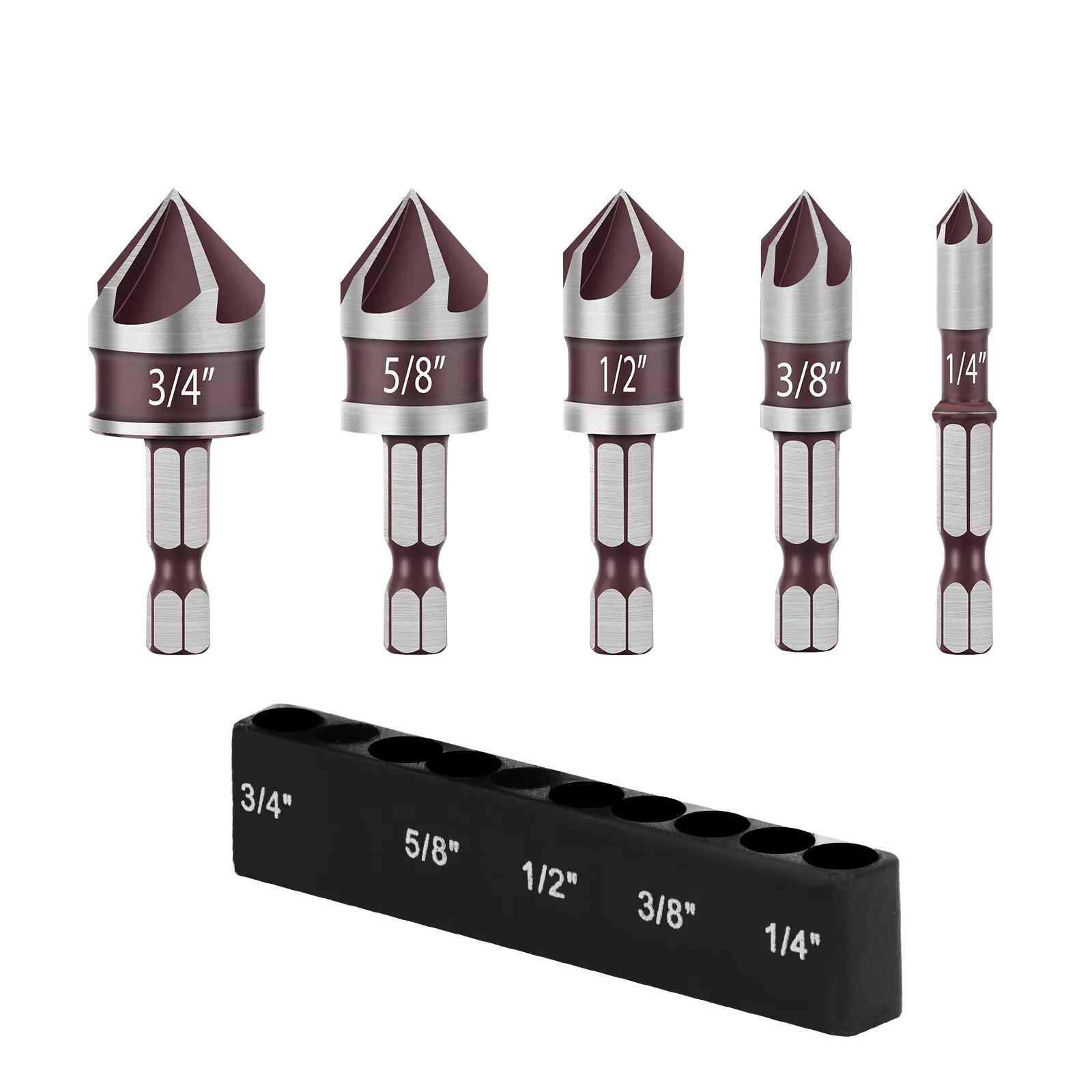Unbranded 5pc Cobalt M35 HSS Countersink Bits, 82° 5-Flute Chamfer Tool Set 1/4"-3/4"