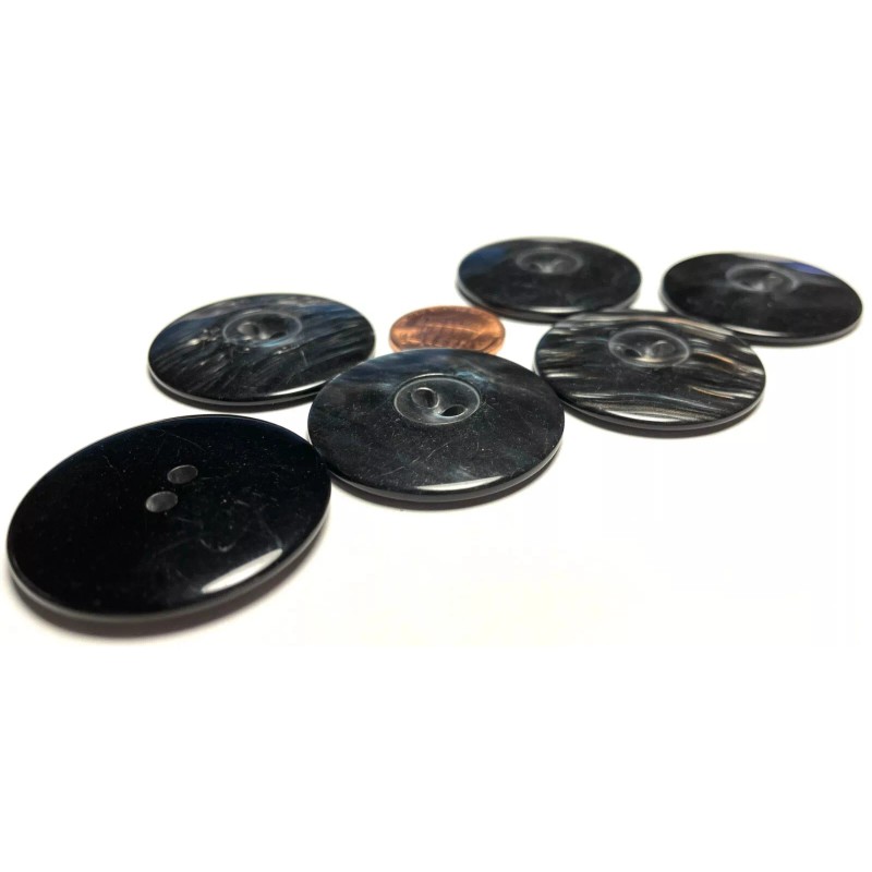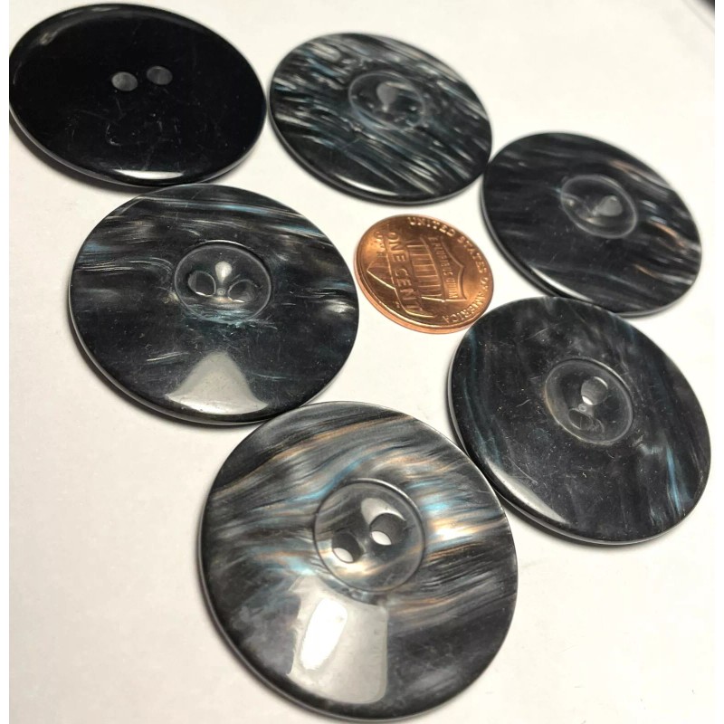 Set of 6 large glossy pearlized dark gray plastic sew-through 2-hole buttons. 34mm almost 1 3/8". Multi-color iridescence.