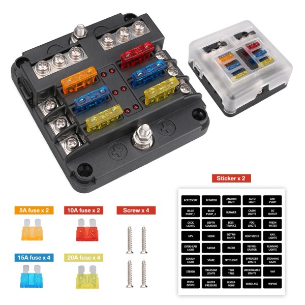 6-Way fuse box with 12pcs fuses as one kit is perfect for car, motor use.
