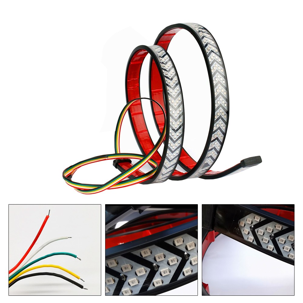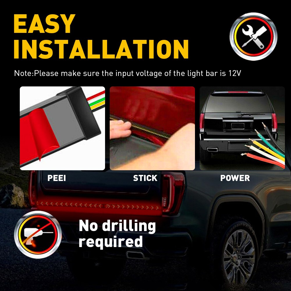 Features: *More advanced with multiple models: More advanced than other tailgate lights, our lights have multiple models for you to improve driving safety. (braking light, turn signal light, double flashlight, etc) *High Brightness: It is equipped with 540PCS LED beads (2835SMD) to enhance clear visibility for the rear drivers and better-ensuring safe traffic on roads. *Simple Installation: Our product with high-quality automotive adhesive makes it not fall off easily. *High Waterproof: IP68 waterproof rate makes it durable and works perfectly in rainy or snowy environments. *Durable This tail light with a fuse inside for short circuit prevention and service life-extending. *Wire connection and corresponding mode: 1. Black connects to negative 2. Red connects to driving light (Sequential red color(SCAN)) 3. Yellow and Green connect to turn signal light(Sequential amber color) 4. White connects to braking light(blink 3 times first, then steady red light)
