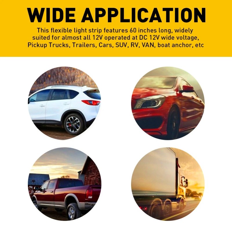 Fit for: This flexible light strip features 60 inches long, widely suited for almost all 12V operated at DC 12V wide voltage, Pickup Trucks, Trailers, Cars, SUV, RV, VAN, boat anchor, etc