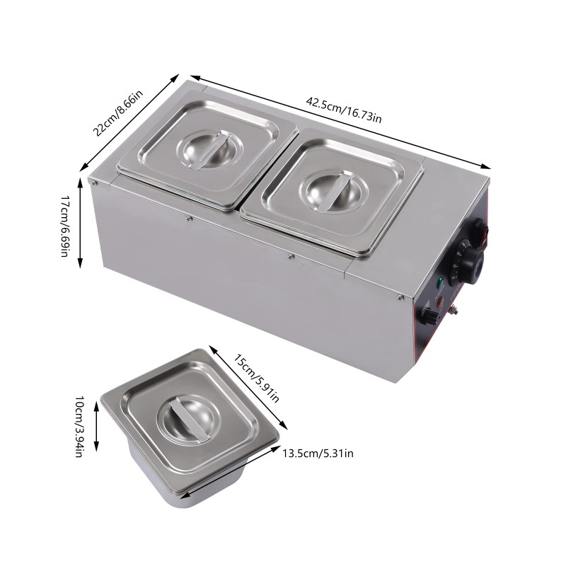 Large Capacity: It has two pots and each of them has a capacity of 3L/0.7gal, which is convenient for you to heat two different ingredients with similar melting points at the same time. Meanwhile, the total capacity of 6L/1.5gal is large enough for commercial use.