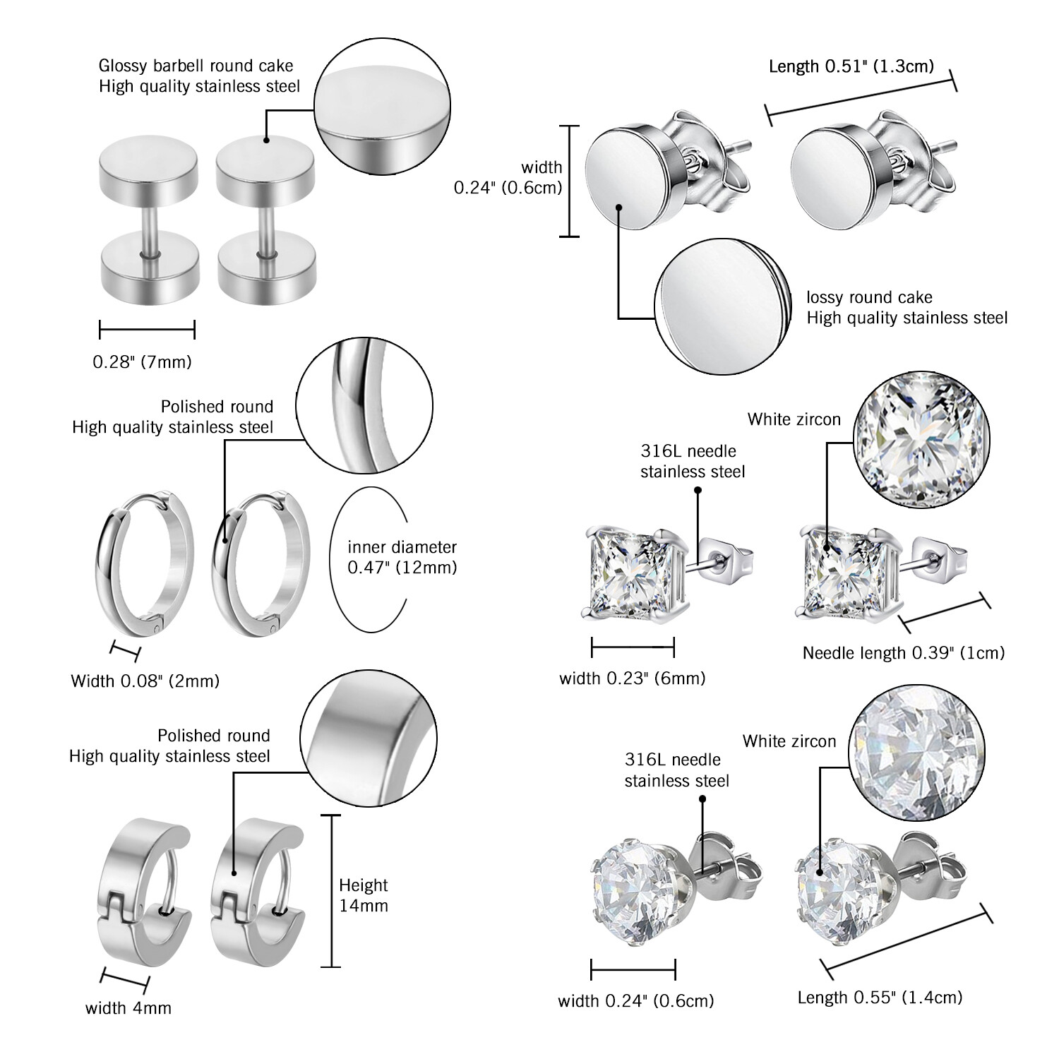 *SIZE--2Pairs CZ Stud Earring: L&W: 0.39"(1cm)*0.23"(6mm)+0.55"(1.4cm)*0.24"(0.6cm); 2 Pairs Hoop Earrings: Width 0.08"(2mm) Inner diameter 0.27"(7mm),0.35"(9mm),0.47"(12mm),0.55"(14mm)+H&W 14mm, 4mm; 2 Pairs Round Stud Earrings: L&W: 0.28"(7mm)*0.28"(7mm)+ 0.51"(1.3cm)*0.24"(0.6cm)