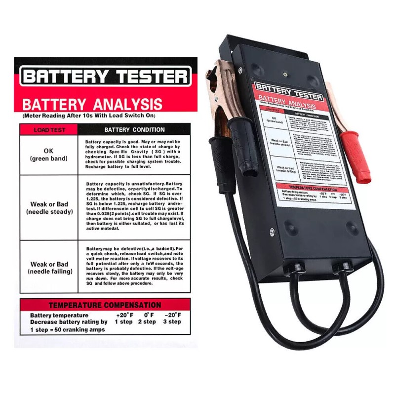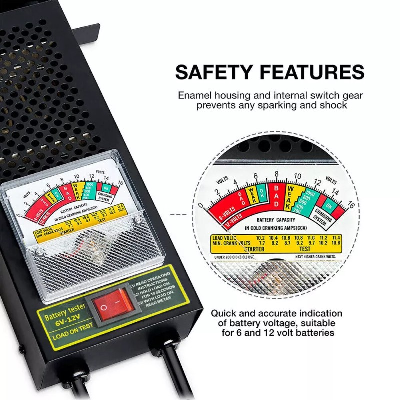 √ Fixed load current of 100 AMP, 100 AMP load test for 12V batteries up to 1000 Cold Crank Amps, 50 AMP load test for 6V batteries up to 1000 CCA. Voltage accuracy of ± 0.2V.