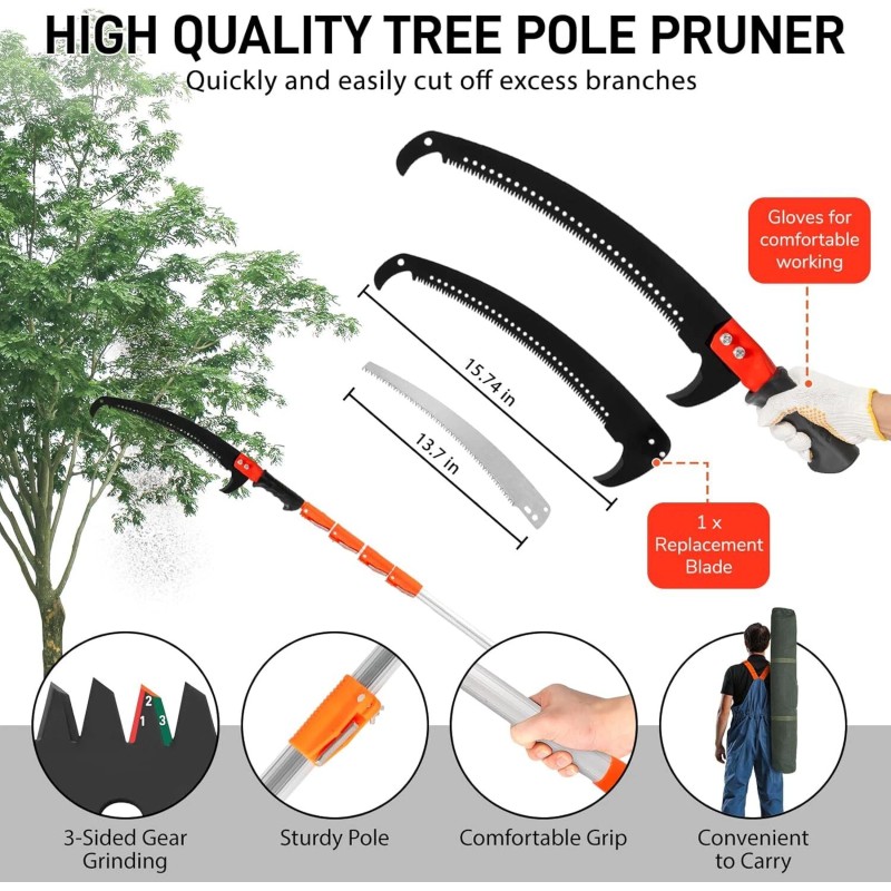 - 【Thoughtful Design】Equipped with a pair of gloves for safe and comfortable work. The pole saws for tree trimming is equipped with a saw sleeve ensures safety by preventing cuts when the tool is inactive. Additionally, we provide a storage bag for all accessories to prevent loss.
