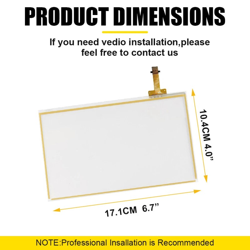 Specifications: OE Numbers: 86100-06341, 86804-06110, 86140-06700, 86100-06031, 86100-06501, 100612, 100368, P1223, 100612 100367, 86100-06492, 86100-06491, LAM0702320A, C070VTN01 Main Material: Glass Size: 7.0 inch (169*103.45mm) Interface: 12-Pin Thickness: 1.5mm Length of Cable: 32mm Length of FPC (flexible print circuit): 33mm Working Voltage: 5V Special Feature: Support Can-Bus. TFT (LCD) technology.