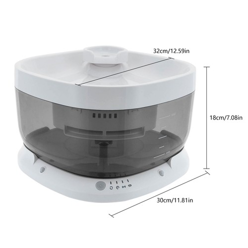 Specification Model: CYD004 Color: White, Clear Grey Material: ABS Process: Injection Molding Style: Modern Assembly Required: Yes Mounting Type: Freestanding Plug Type: US Standard Power Source: Corded Electric Battery Capacity: 5000mAh Output: 5V, 1000mAh Input:  100-240V 50/60Hz  0.2A                     Bucket Capacity: 7L/1.85gal Water Tray Capacity: 400ml/0.11gal Noise: 30dB Product Size: 32*30*18cm/12.59*11.81*7.08in   Package Included 1* Cat Water Fountain 2* Filter Elements 1* English Manual Other Accessories for Assembly