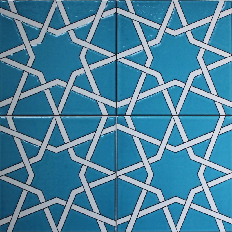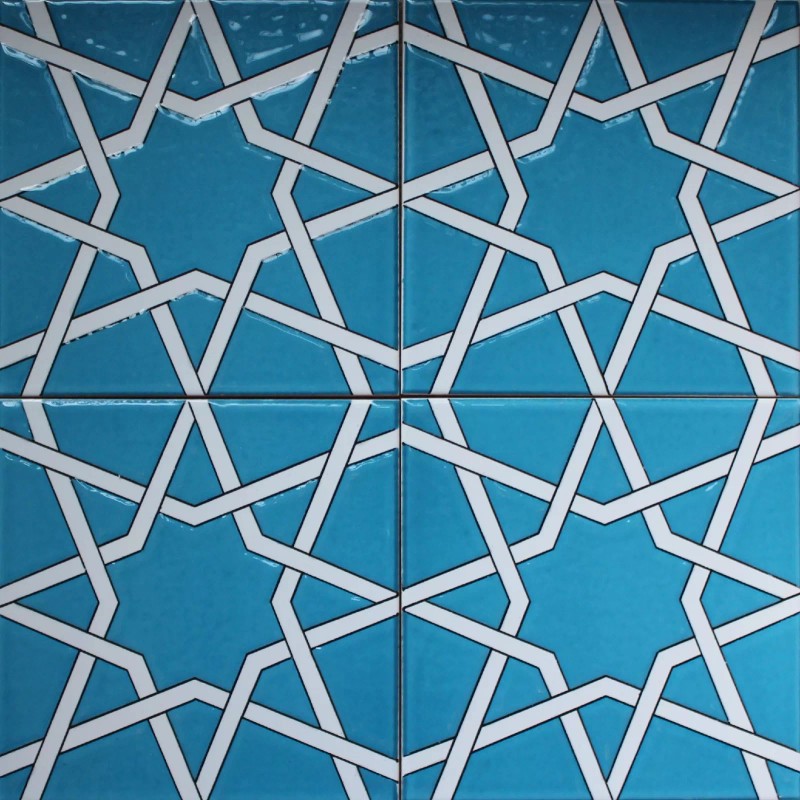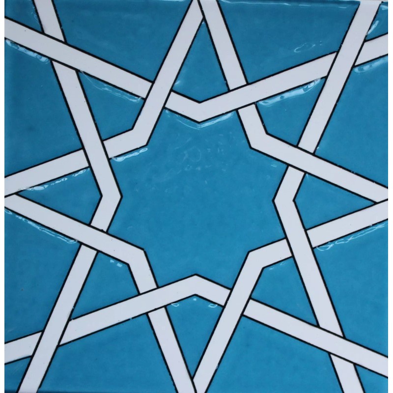 8"x8" (20cm x 20cm) Turkish ceramic tile. Main colors on this tile are turquoise and white. This tile is decorated with Ottoman geometric patterns. This tile is decorated with original 16th-17th century Iznik floral patterns. Turquoise sections on the tile is raised/textured (in-relief) form. First picture shows individual tile and second shows 4 of these tiles together. These tiles has a layer of glaze on them and they can be used at moist areas.