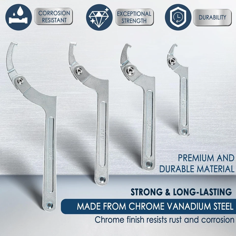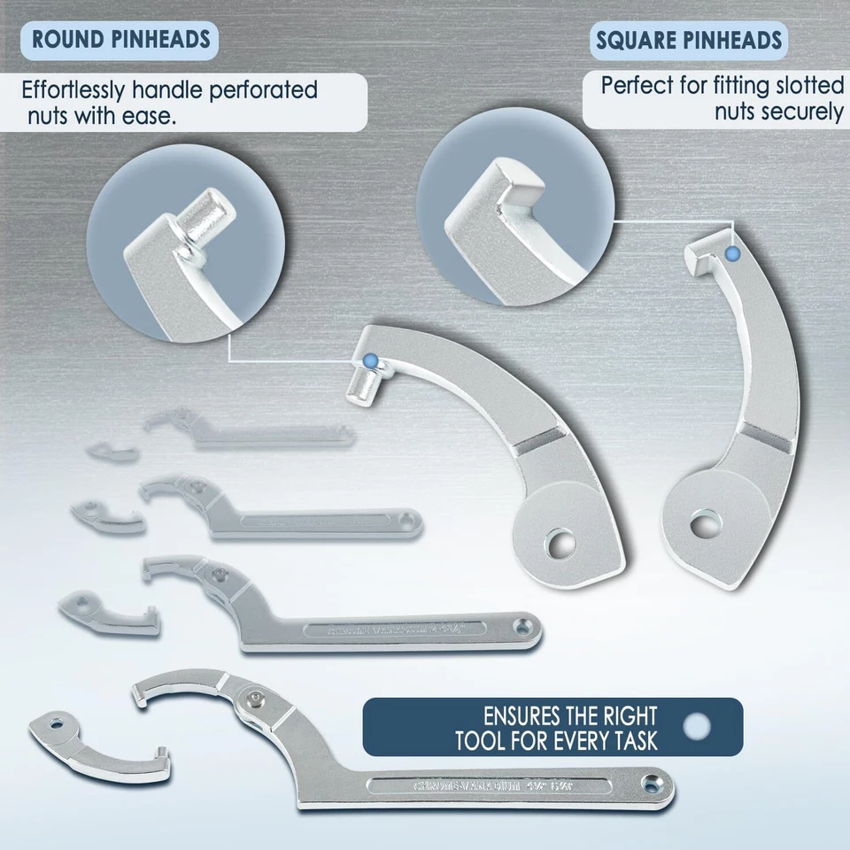Adjustable C pin spanner hook wrench tool set covers most commonly needed sizes from 3/4" to 6-1/10" (19-170 mm). Designed for easy coilover, lock nut, and bearing adjustment, widely used in repairing cars, heating systems or pipe fittings.