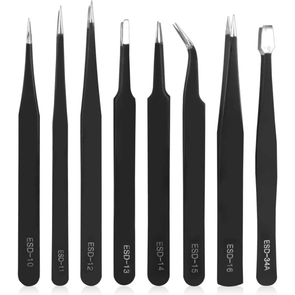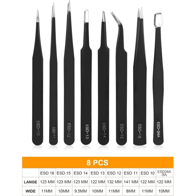 - Set Includes: 8 professional anti-static stainless steel tweezers