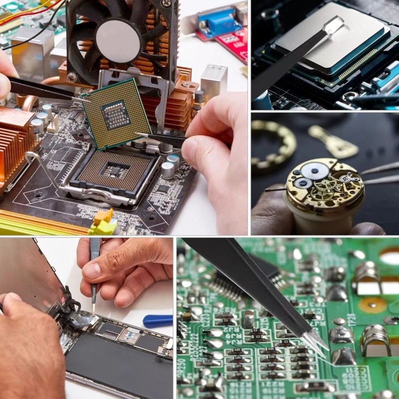 The set includes 8 tweezers of different specifications, along with a storage bag, designed to meet a variety of needs. Ideal for PCB repair, watch repair, crafts, jewelry work, electronics, laboratory tasks, and beauty applications such as eyebrows, eyelashes, and hair removal.