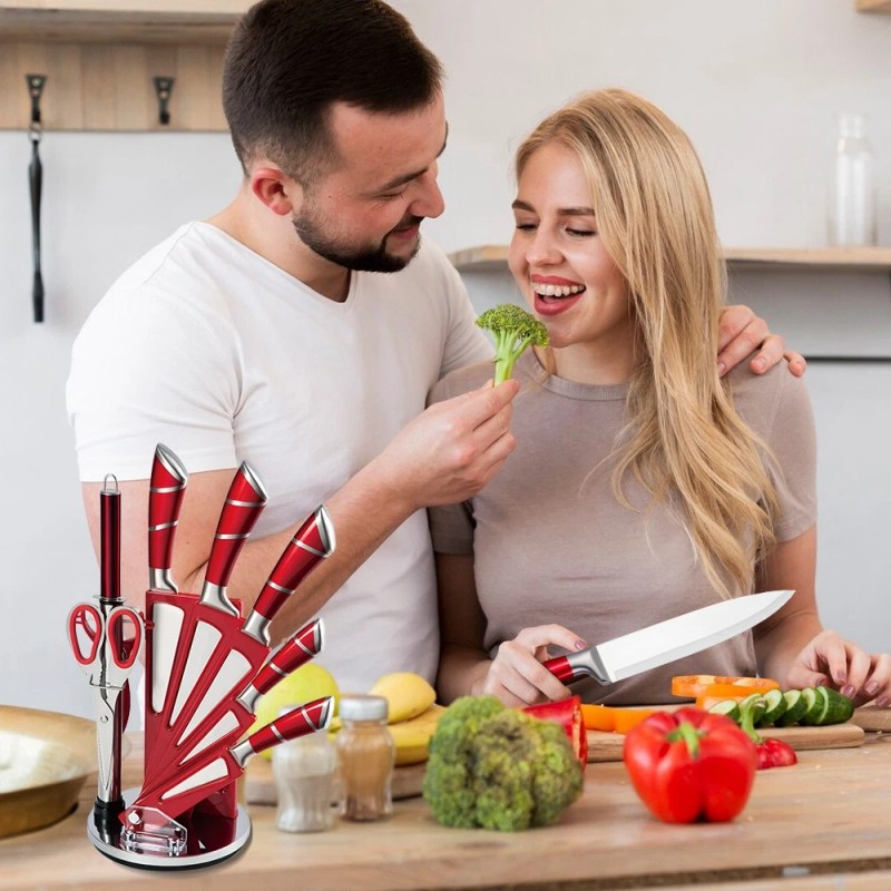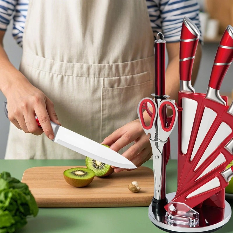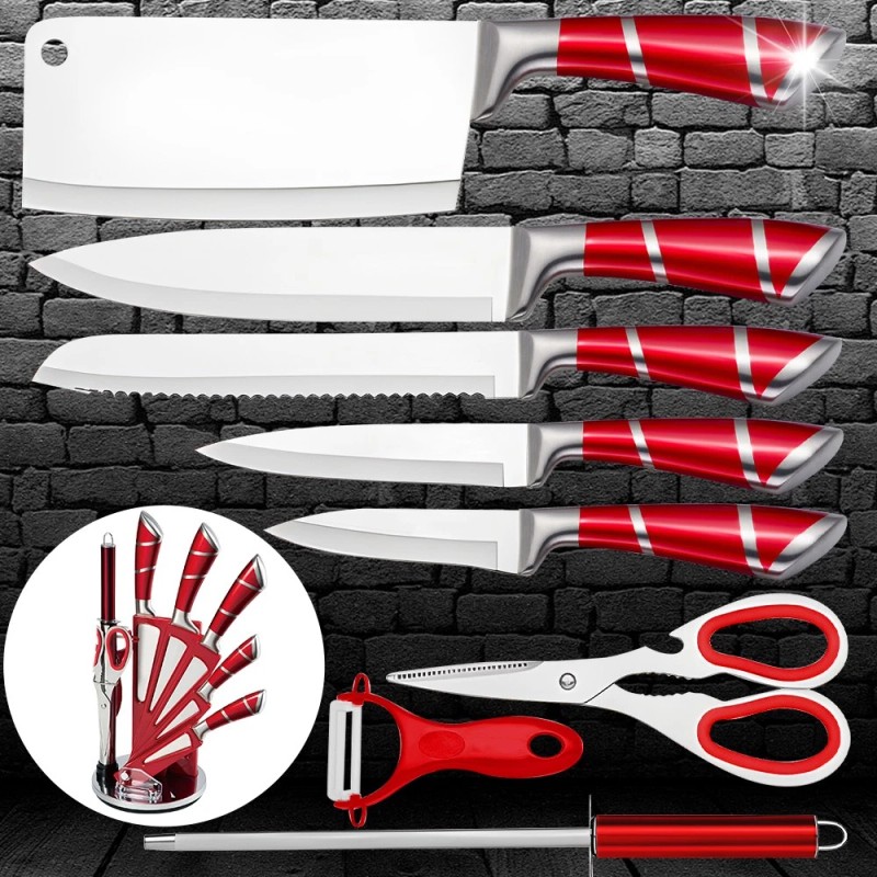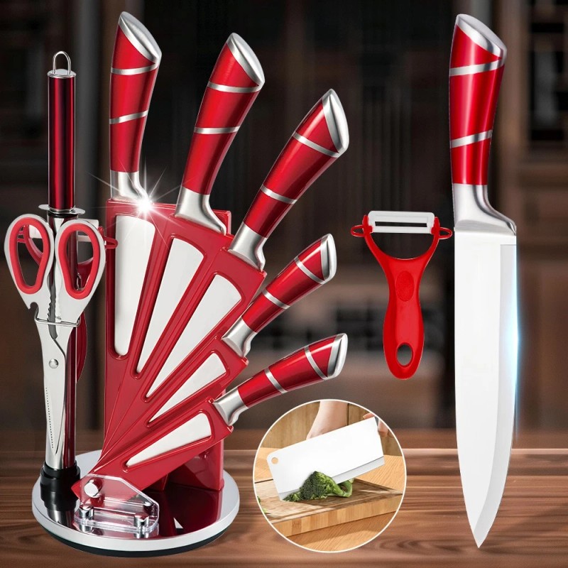 9 Piece knife set: The red professional knife set includes: 1 kitchen knife, 1 chef knife, 1 bread knife, 1 universal knife, 1 fruit knife, 1 sharpening stick, 1 scissors, 1 peeling knife, 1 acrylic bracket. The knife holder is stored to save kitchen space. This perfect knife set can meet all kinds of needs of your daily kitchen life