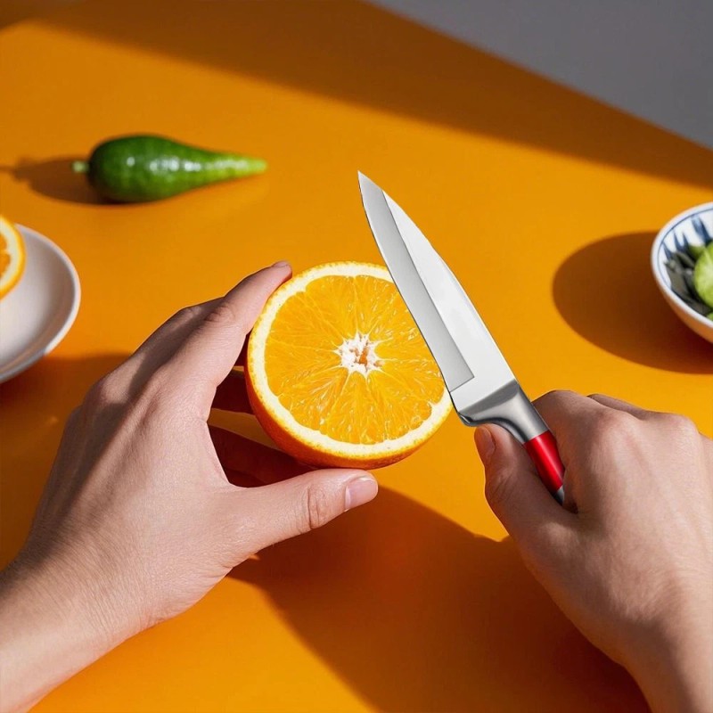 High quality kitchen knife set: The red kitchen knife is made of high-quality stainless steel, which has excellent corrosion resistance and oxidation resistance, ensuring that the kitchen knife set is not easy to rust. At the same time, the appearance of fashionable and high face value is very eye-catching